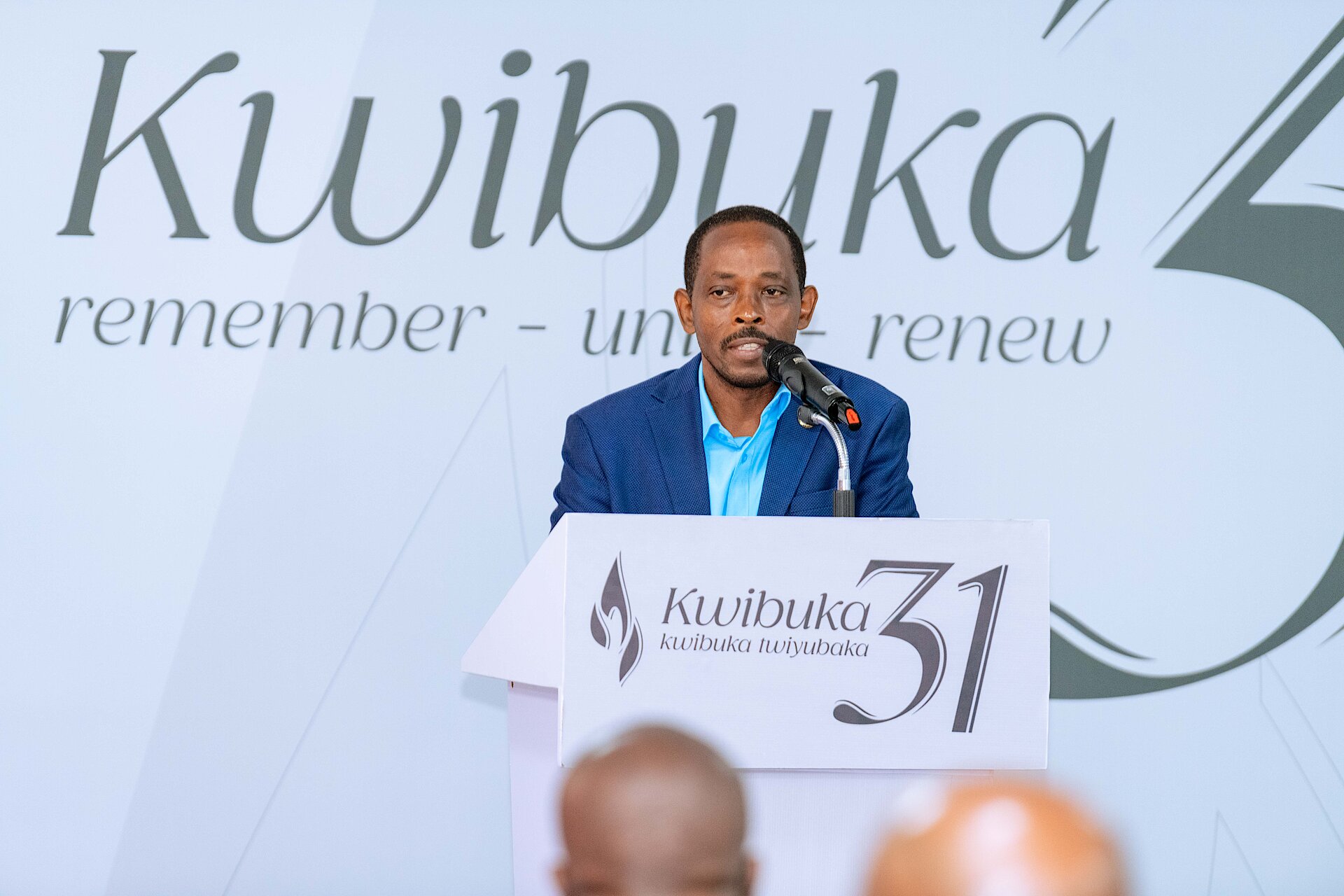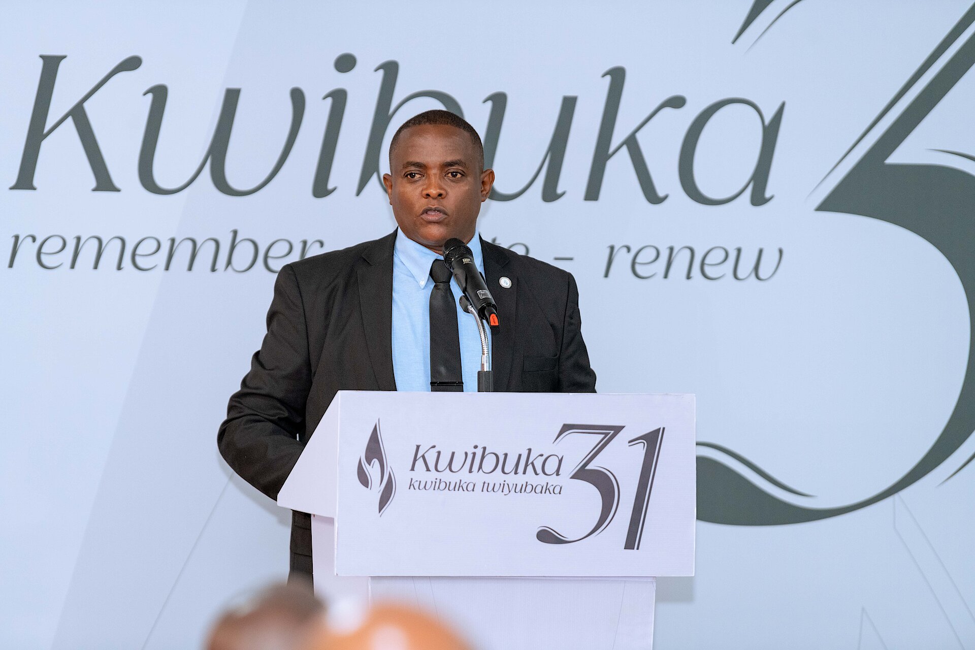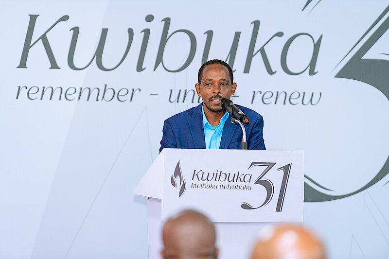Survivor Jean Maurice Gasasira giving testimony: Genocide survivor Jean Maurice Gasasira “Sadam” shares his journey of pain, forgiveness, and patriotic duty. “Forgiveness is strength,” he says.